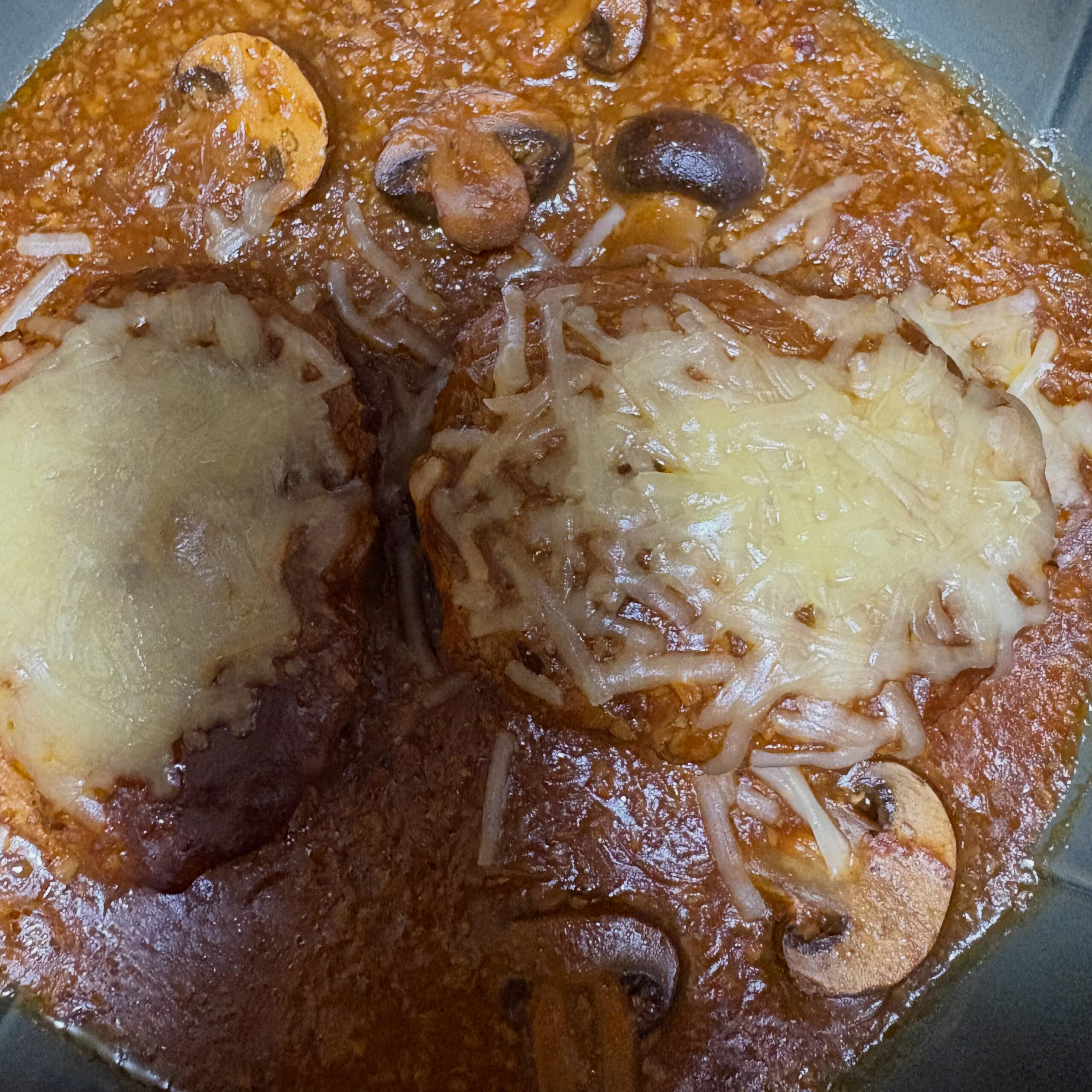 ハンバーグを置いて、ルーミックとお水、マッシュルームをかけて、炊飯器スイッチオンです。