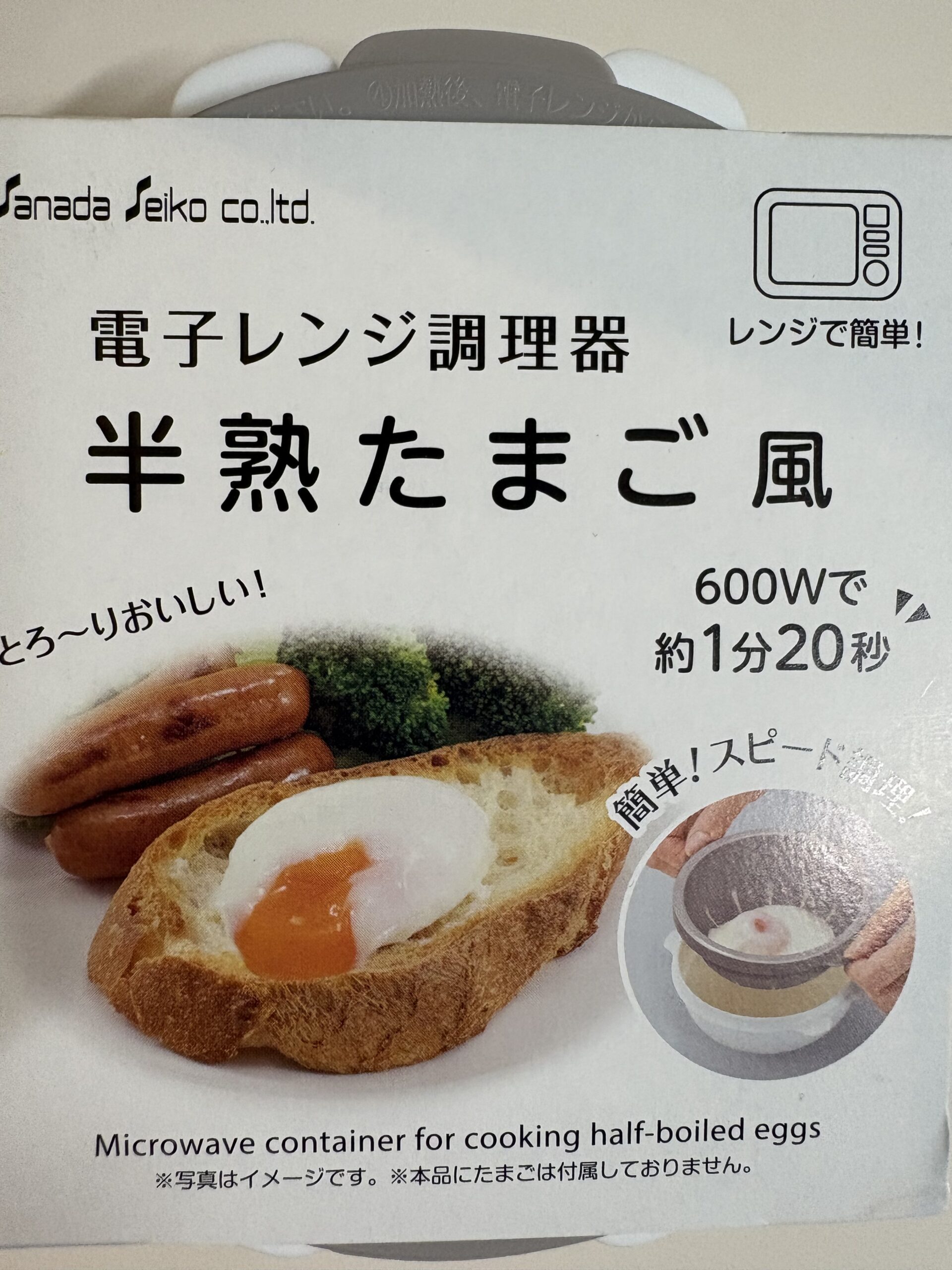 ダイソーで発見しました! なんと半熟卵をレンジで作る器具です。 レンジでゆで卵を作る器具は以前から使っておりますが、 半熟が作れるとなると、メニューの幅が増えますねぇ。 パスタでカルボナーラの上にのっけたり、 親子丼の上にさらにのっけたり、、、 最近、レンジや電気圧力鍋等を使えば、コンロを使う機会が減った気がします。