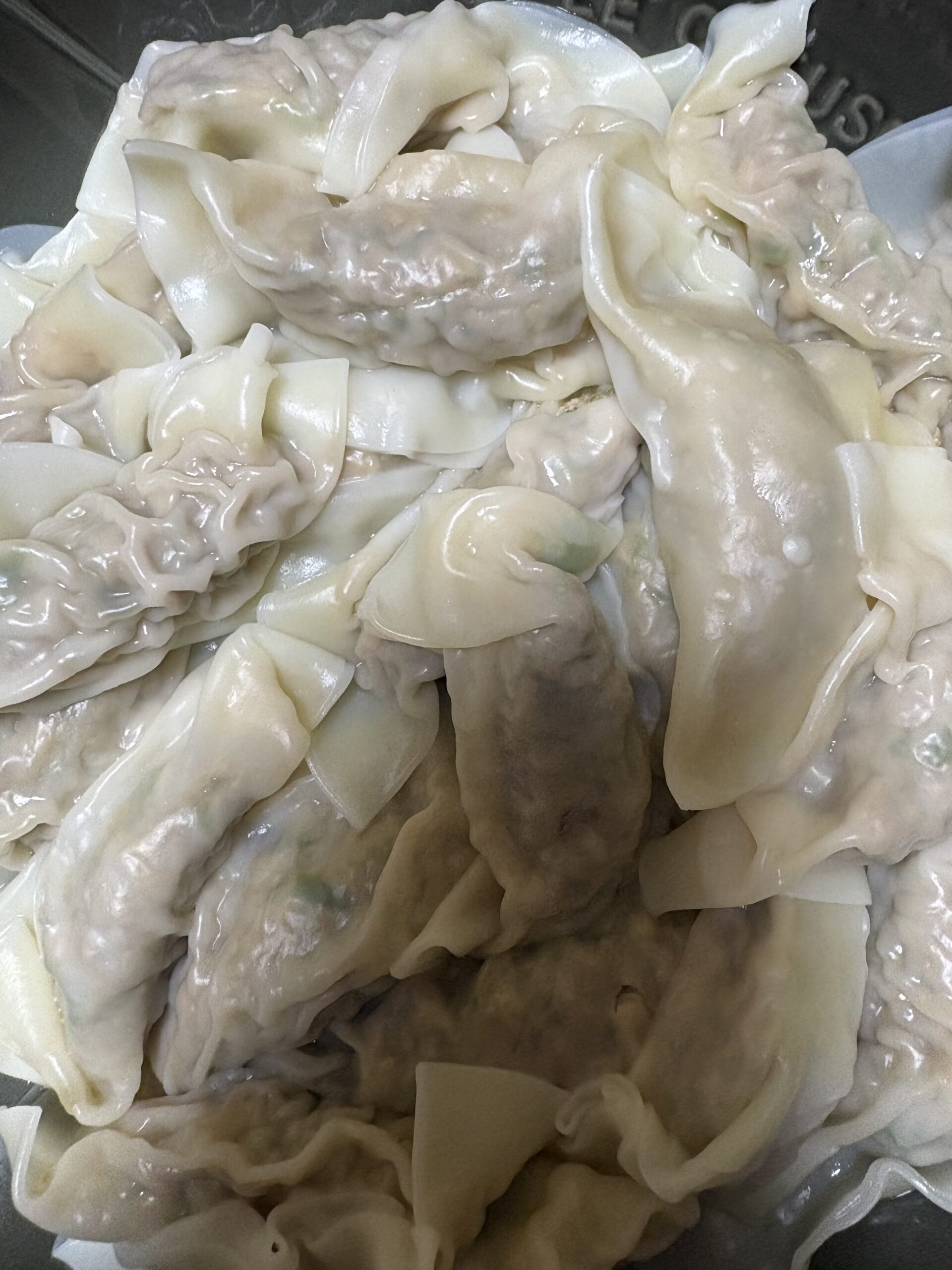 餃子ブーム続いております。 本日は、青椒肉絲の具材で作りました。 ピーマン竹の子をみじん切りにして、 牛挽肉を加えてから、オイスターソースを加えます。 前回の皮と違い、破れやすいので、水餃子にしました。 さいごは、カラシを付けていただきます。 我ながら天才だと思います。