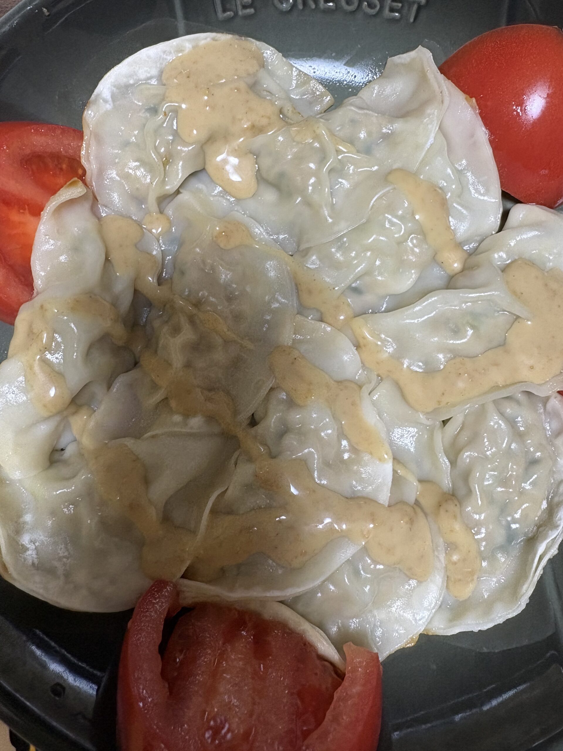 一週間大変お疲れ様でした、スタッフと私。 本日は、棒々鶏をイメージした餃子を作ってみました。 鳥挽肉にめんつゆとゴマだれで下味をつけて、 みじん切りしたきゅうりと混ぜます。 焼いてから、ゴマだれをかけるだけのシンプルな感じですが、 こんなさっぱりした味わいの餃子は初めて食べました。 なんか、マジでお店出来るかも?!