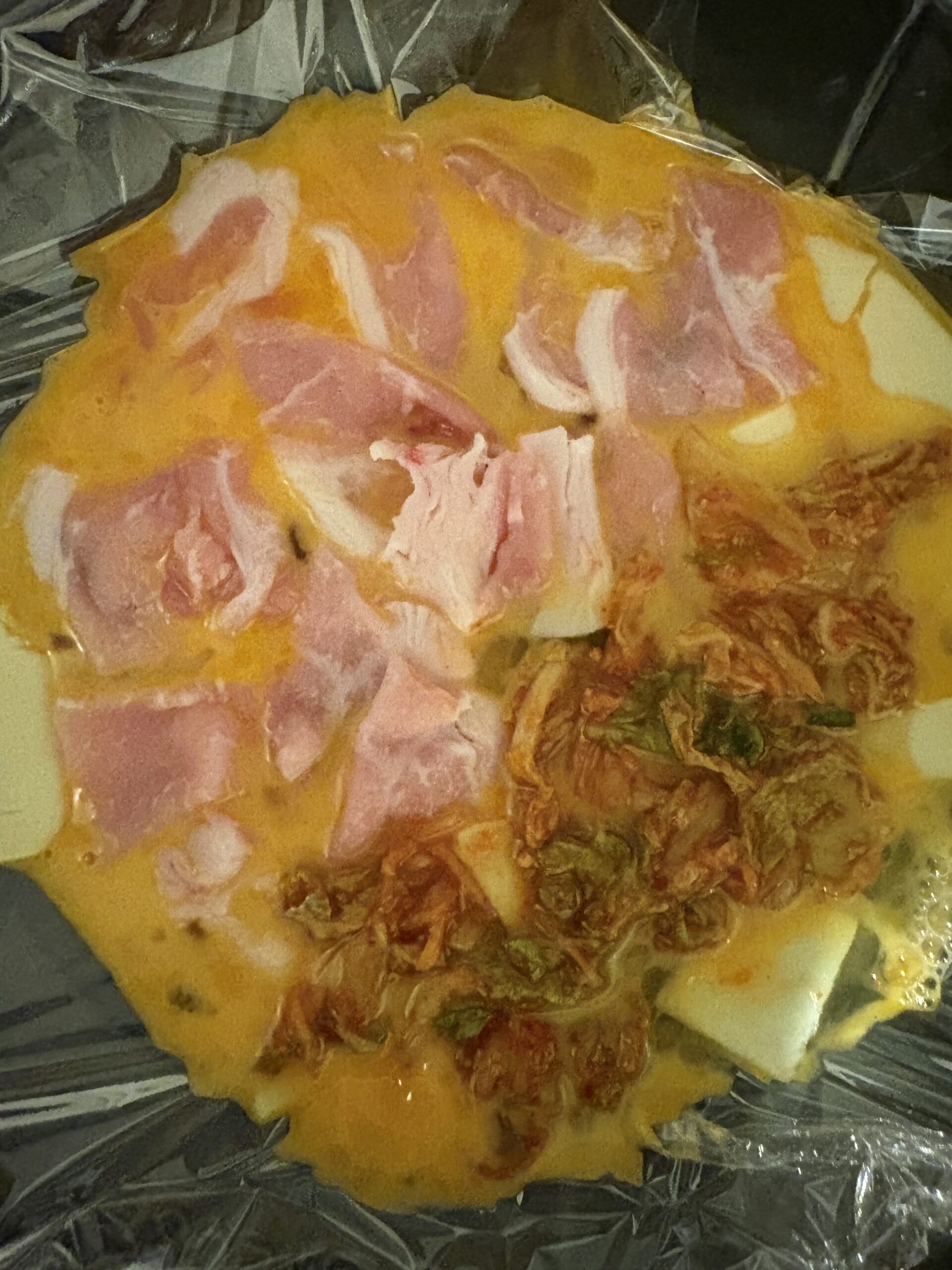 YouTubeで学んだレンジでのとんぺい焼きを久しぶりに作りました。 今回は、玉子にチーズをひいて、 豚肉とキムチを乗せてみました。 ポイントは、買った具材を乗せすぎないことです。 どうしても使い切るために乗せがちですが、 あんまり乗せると玉子が破けて、空中分解します。 今回はだいぶ自制しました。