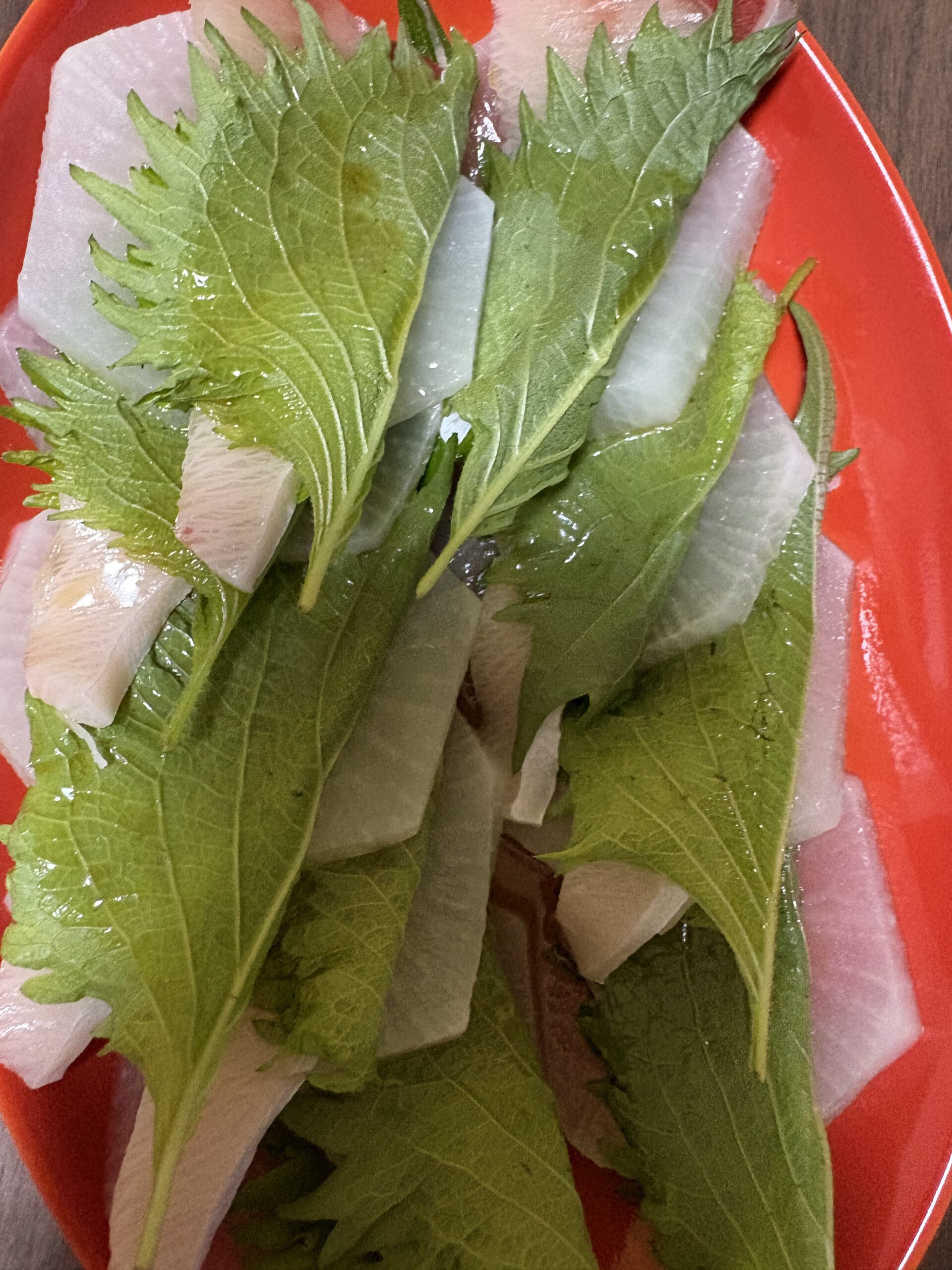 ブリのお刺身と大葉をのっけて、ミツカン丸絞りゆずをかけてみました。