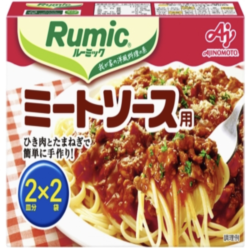 ルーミックは、味の素が1970年代から販売している100円ちょいの商品です。ミートソース用の赤色のパッケージとホワイトクリームソース用の白色のパッケージとがあります。
